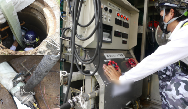 また、特殊溶剤を蒸気の熱で管内で固め下水道管を再生します。